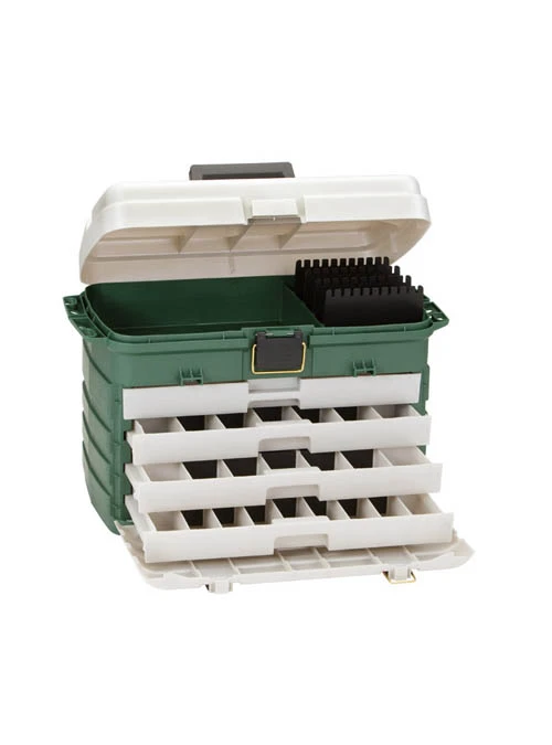 The Plano Four Drawer System includes large bulk storage, four removable bait racks, as well as side tool storage.